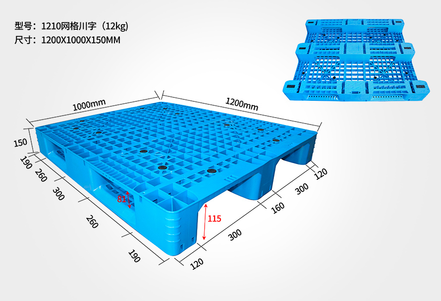 | 1210網(wǎng)格川字托盤 | 1200*1000*150/165 | 10/11/11.5/12/13.5/14.5 | 1.5T | 5T | 8/10 |